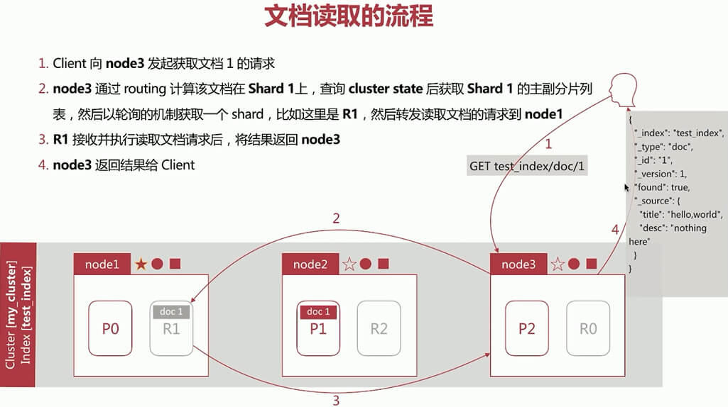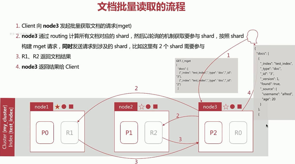 - 副本分片由主分片同步数据,可以有多个,从而提高数据吞吐量。