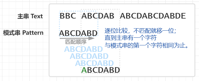 逐位比较,不匹配就移一位;直到主串有一个字符与模式串的第一个字符相同为止。